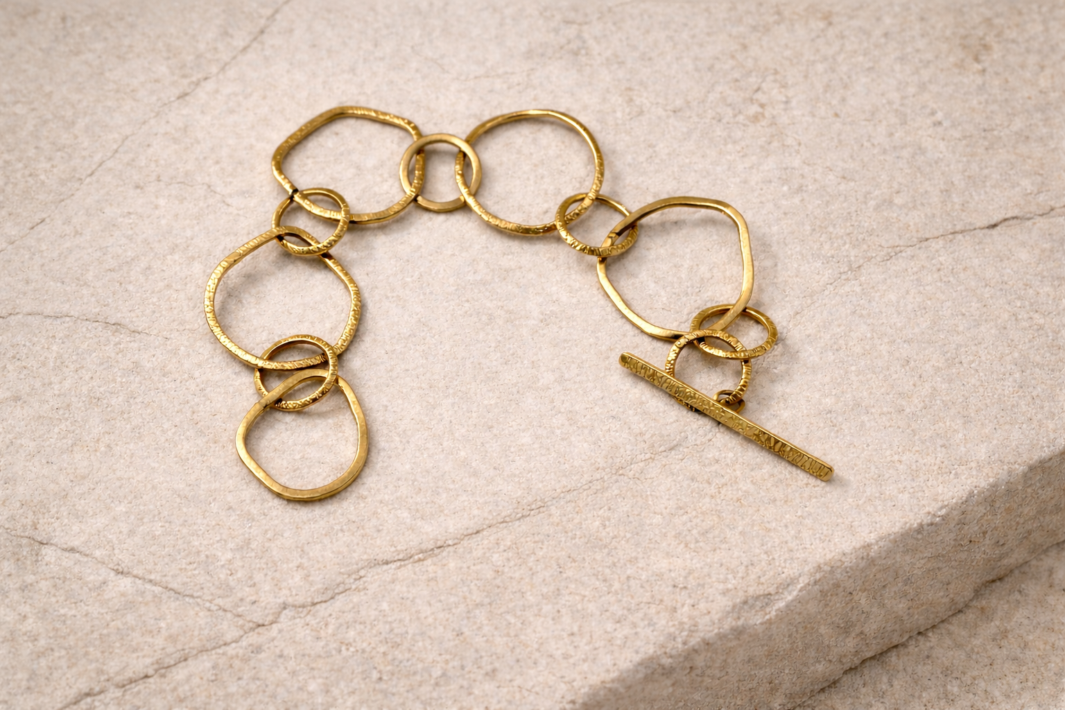Make a subtle statement with this abstract circle-link bracelet ,an artistic mix of irregular round and angular links, this bracelet balances modern design with organic flow. The T-bar toggle closure completes the look with ease and style.