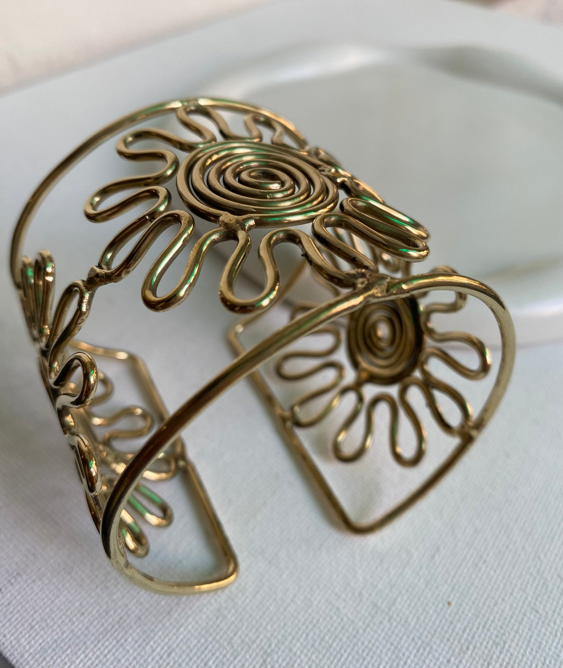 Inspired by the warmth of the sun, this handcrafted gold cuff showcases intricate spiral and wave-like wirework that radiates outward in a bold, artistic design. Lightweight yet statement-making, it embodies free-spirited energy and bohemian elegance. Perfect for elevating both everyday outfits and special occasion looks.
